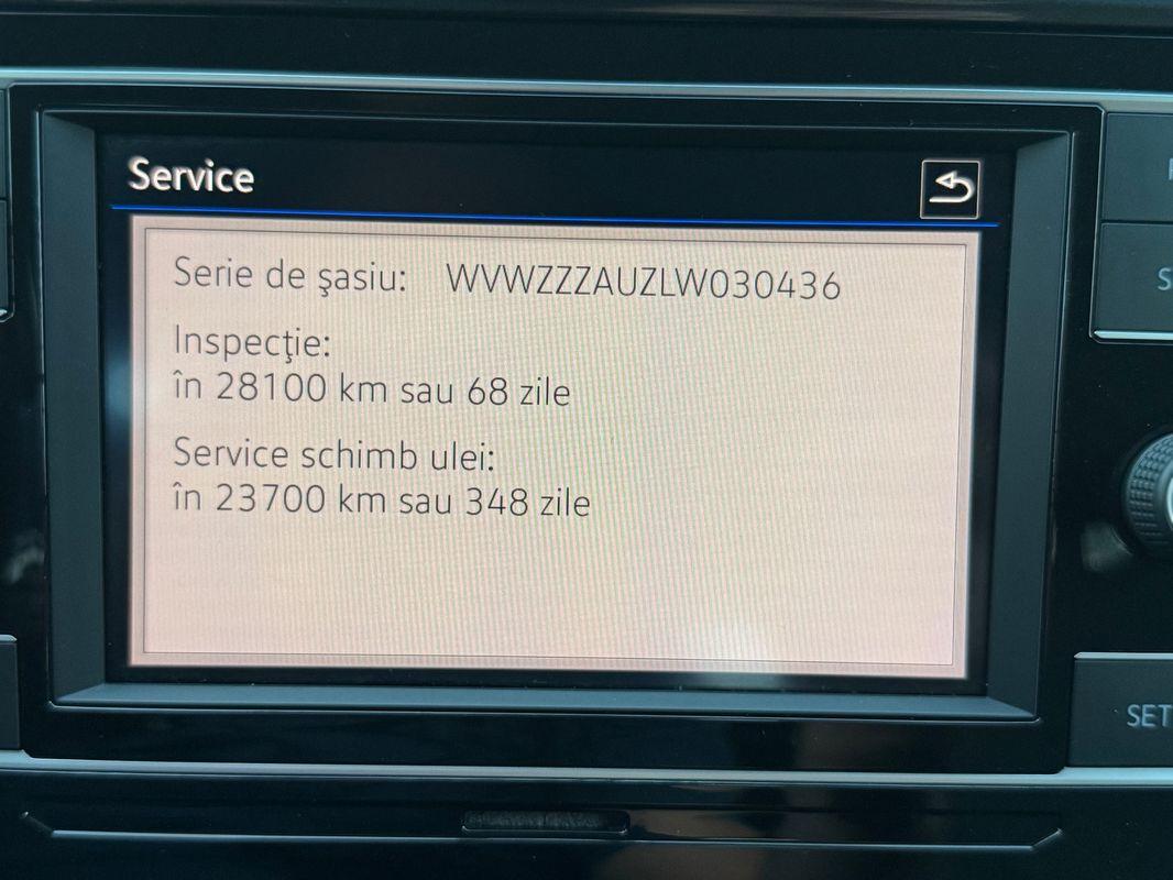 AV8 va oferă la vânzare auto VW GOLF 1.6 TDI 115 CP MAN 5 TREPTE AN FABRICATIE - 2019 PRIMA INMATRICULARE - 11.2019 SERIE SASIU : WVWZZZAUZLW030436 ITP valabil pana la data: 16.10.2026 Rulaj certificat si garantat contractual SPECIFICATII SI DOTARI Istoric service - ISTORIC COMPLET IN RETEAUA VW ABS/ESP ACC ( Adaptive Cruise Control ) - Pilot automat adaptiv Airbag- uri frontale șofer si pasager Airbag- uri laterale cortina fata si spate Auto Hold Bancheta spate fractionabila 2/3 si 1/3 cu compartiment pentru bagaje lungi Climatizare automată pe 2 zone Cotiera centrala fata cu spațiu de depozitare Cotiera centrala spate cu suport pentru pahare Computer bord Cruise Control ( pilot automat cu funcție de frânare ) Chei disponibile: 2 buc Conectare telefon prin Bluetooth si USB Drive alert - Recunoaștere oboseala șofer Ecran multimedia de 7" Fixare ISOFIX pentru scaun copil Front Assiat - Sistem detectare obstacole Frâna de parcare electrohidraulică Funcție Coming home/Leaving home pentru faruri Geamuri electrice fata si spate Inchidere centralizata cu telecomanda Jante aliaj pe 16" Lumini de zi LED Oglinzi retrovizoare reglabile si incalzite electric Radio și sistem audio integrat Privacy glass - geamuri fumurii Proiectoare ceata Scaun șofer reglabil pe înălțime si lombar Sistem Start&Stop Senzori de presiune in pneuri Senzor de ploaie si lumina Servo directie asistata electric Tapițerie stofa Transmisie manuala 5+1 trepte Volan si schimbător de viteze îmbrăcat in piele Volan multifuncțional Volan reglabil pe adâncime si înălțime Consum mediu: 5.4 l/100 km Emisii CO₂: 117 g/km Norma de poluare: Euro 6 INFORMATII PRET Prețul cuprinde TVA deductibil Cursul EURO este calculat la cursul BNR + 1% din ziua efectuării plății Auto este eligibil pentru finanțare atât pentru persoane fizice cât si persoane juridice. INFORMATII REFERITOARE LA GARANTIE GARANTIA oferită autoturismului este de 12 luni sau 15000 km Se oferă OPTIONAL posibilitatea extinderii GARANTIEI pana la 36 luni sau 40000 km SERVICII DE LOGISTICA OFERTITE Se oferă NUMERE PROVIZORII pentru o perioada de 90 de zile pentru auto importate. Se oferta serviciul de livrarea auto pe platforma in toată tara, GRATUIT in Mun București si Jud ILFOV. Consiliere înmatriculare auto. Notă informativă: • Informațiile prezentate în acest anunț sunt cu titlu orientativ. Pot exista erori de redactare sau omisiuni involuntare privind dotările, performanțele motorului, capacitatea cilindrică, transmisia sau alte caracteristici tehnice.Pentru confirmarea completă a dotărilor, vă recomandăm verificarea acestora în baza seriei de șasiu la reprezentanța mărcii sau la fața locului.Detalii suplimentare pot fi oferite și telefonic.